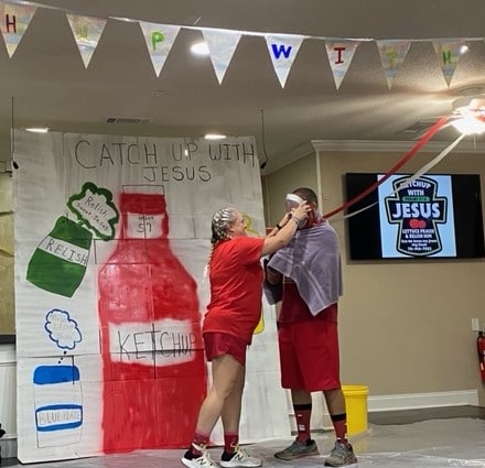 Also, a BIG surprise happened and it was all about Ketchup!! They are having a competition against the girls verses the boys each night. The girls won Sunday, so the surprise was Ms. Ketchup got to put a ketchup pie in Mr. Ketchup’s face! Mr. and Mrs. Ketchup are Brother Jarott Williams and Mrs. Heather Williams.