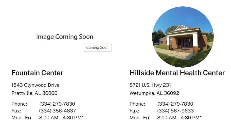 Under MAMHA, their website lists five facilities. They include the MAMHA Complex on Upper Wetumpka Road in Montgomery; the Fountain Center on Glynwood Drive in Prattville (Note: “Image Coming Soon” is displayed); Hillside Mental Health Center on U.S. 231 in Wetumpka; Lowndes County Mental Health Center in Hayneville; and Adolescent Total Care on Coliseum Boulevard in Montgomery (Note: “Image Coming Soon” is displayed.)