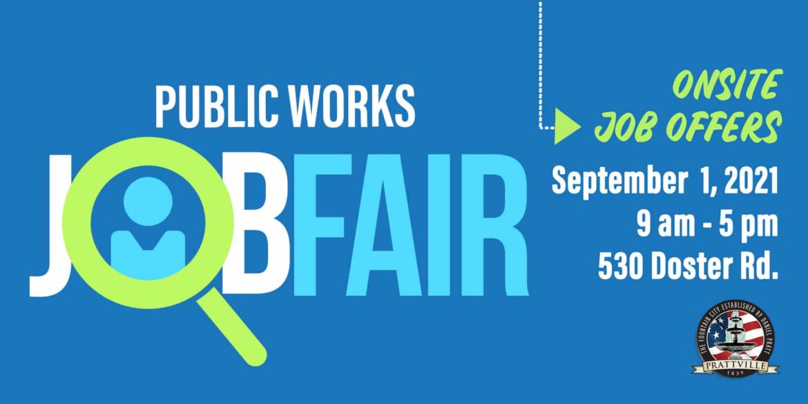 The City of Prattville will be hosting a Public Works Job Fair on Wednesday, September 1, 2021, from 9 a.m. to 5 p.m. at the Public Works facility located at 530 Doster Road.