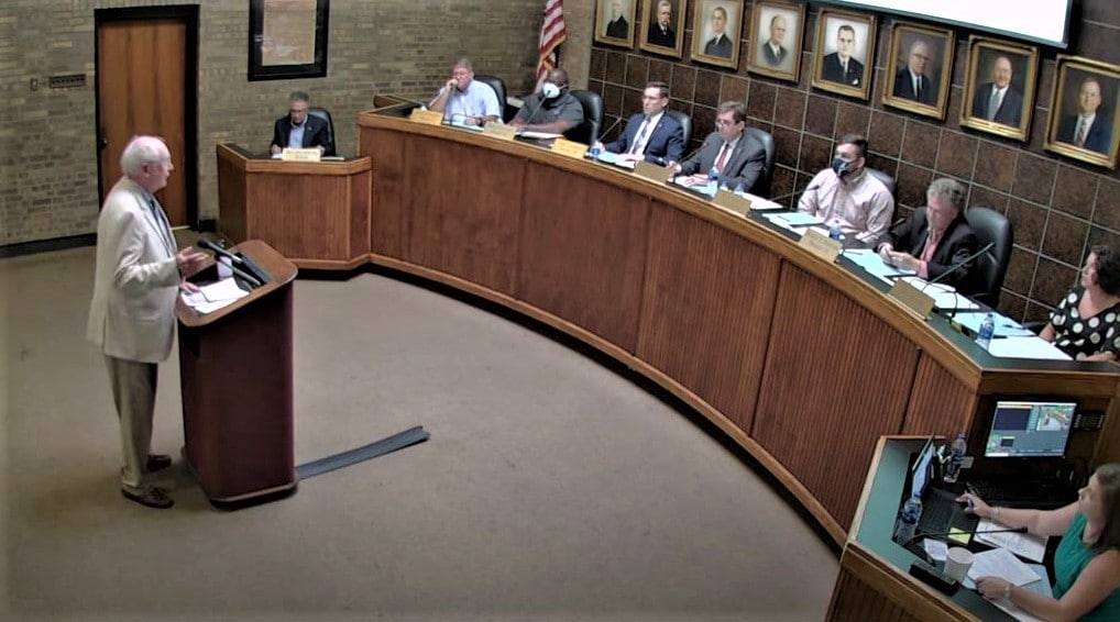 Top Photo: Still shot from video of Prattville City Council meeting Aug. 17 with Attorney Jim DeBardalaben addressing the council members.