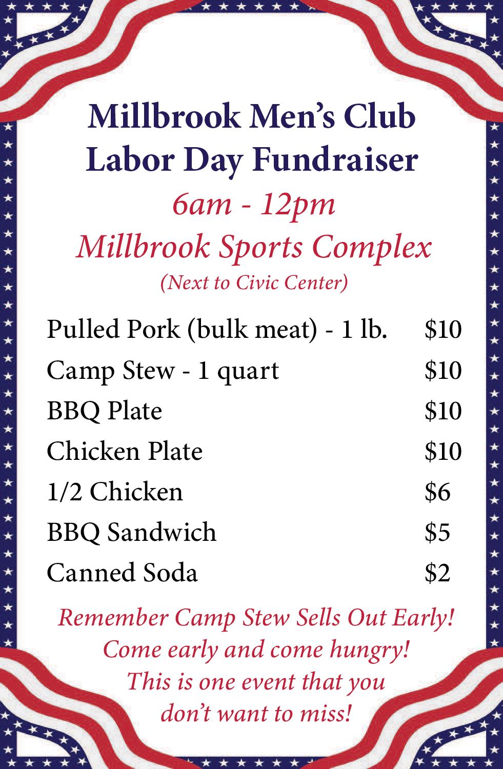 The Millbrook Men’s Club will host their annual Labor Day Barbecue Sunday beginning at 6 a.m.