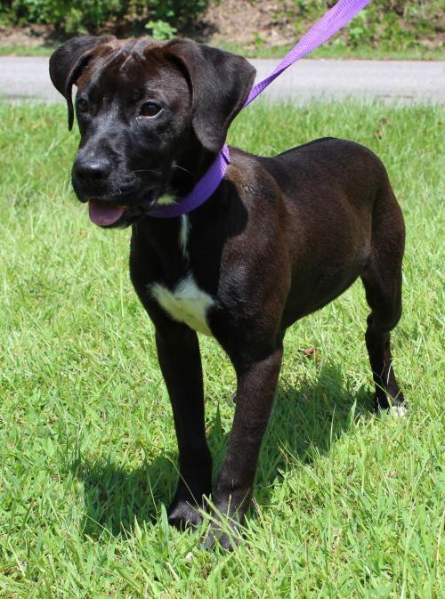Cinder is a 4-month-old female Lab/Pitt mix who was found as a stray and her owner never came looking for her. She has a beautiful black coat but when she is in the sunlight it has a chocolate look to her. Cinder has beautiful white markings; she is just a pretty girl! She currently weighs 27 pounds; and she could stand to gain some weight.