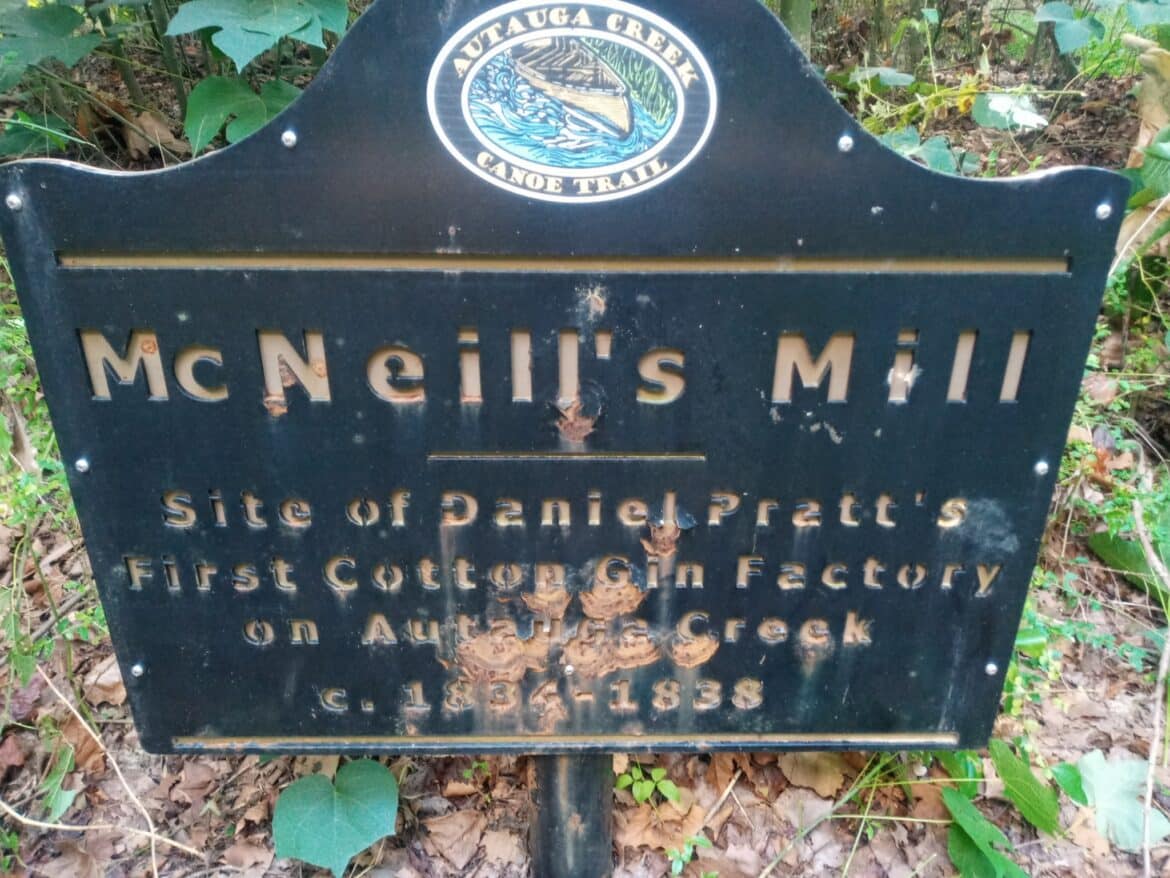 PLEASE do not Trespass on this Private Property. Instead, pull up across the Creek, enjoy from a distance. There is NOTHING there but a Marker. All artifacts that were recovered, along with a detailed and very informative kiosk that outlines the history and dateline of Prattville’s Founding Father Daniel Pratt and his time there. This is now on display Downtown on the corner of First and Chestnut and in front of the Museum. It is a block up on the corner of Main and Chestnut. There are also smaller items inside the Museum.