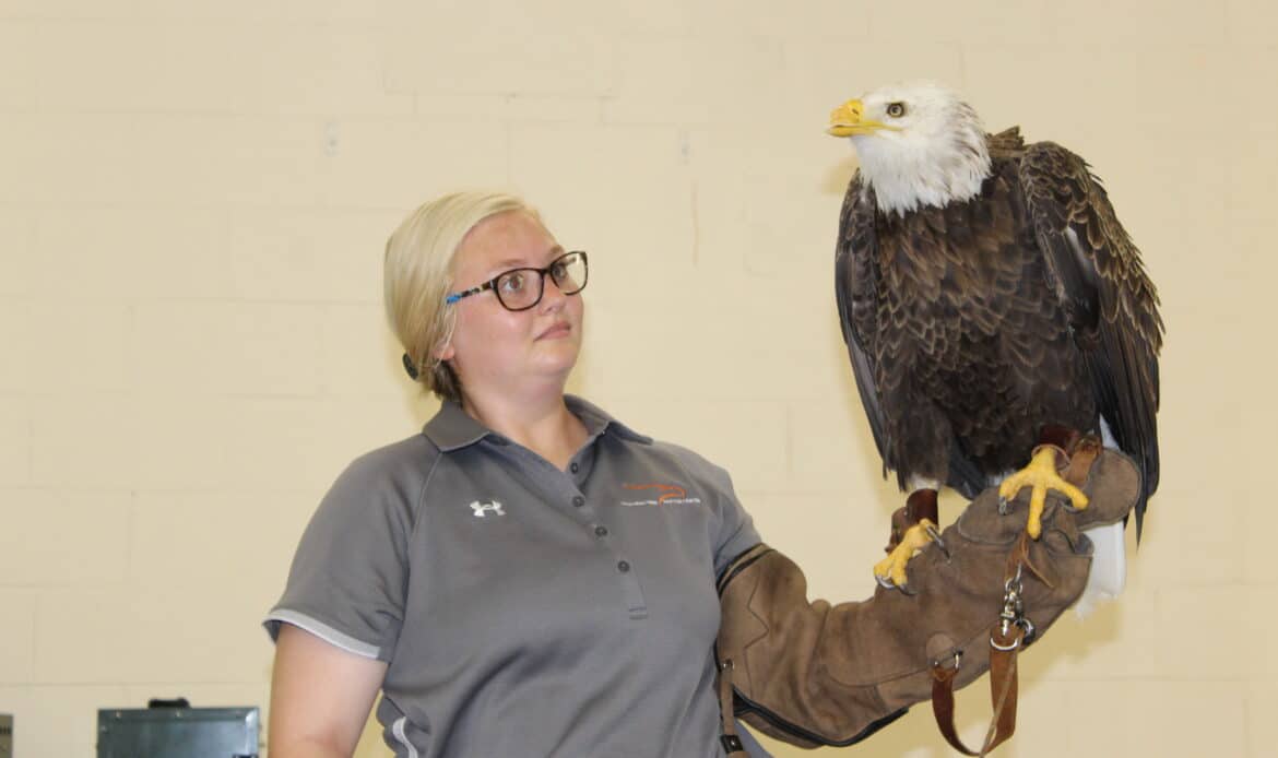 Sharp beaks and talons kept the large audience of boys and girls captivated. The staff brought a Screech Owl, a medium-sized Barn Owl, a large Great Horned Owl, a Red-tailed Hawk, a falcon, a vulture and a Bald Eagle. The center has a total of 22 birds and does a total of 250-350 shows per year.