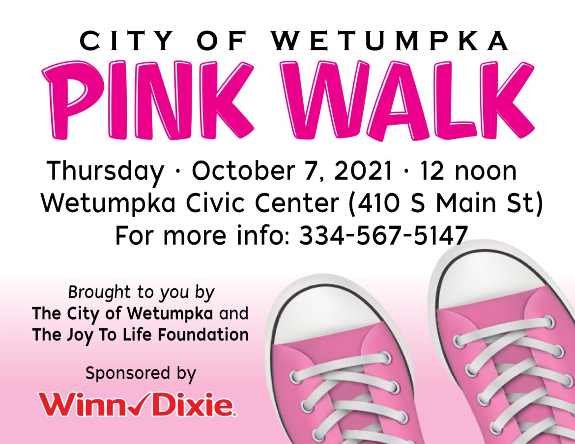 Thursday, Oct. 7 at noon you are invited to come to the Wetumpka Civic Center and take part in the Pink Walk so help fight breast cancer. The event is hosted by the City of Wetumpka and the Joy To Life Foundation. It is sponsored by Winn Dixie.