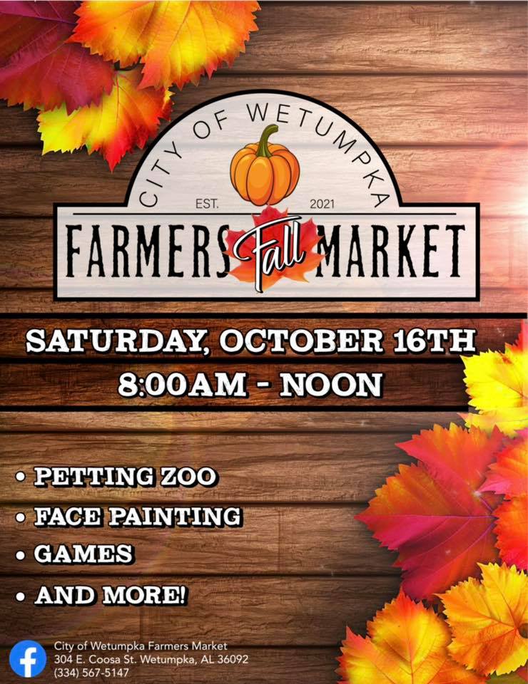 Come and fall in love with Wetumpka at our first ever Fall Farmers Market Festival! Our farmers and vendors will be back, and a few more surprises, to serve you all their goods! Be sure to stop by for some fun for the kids as well as the adults! See y’all there!