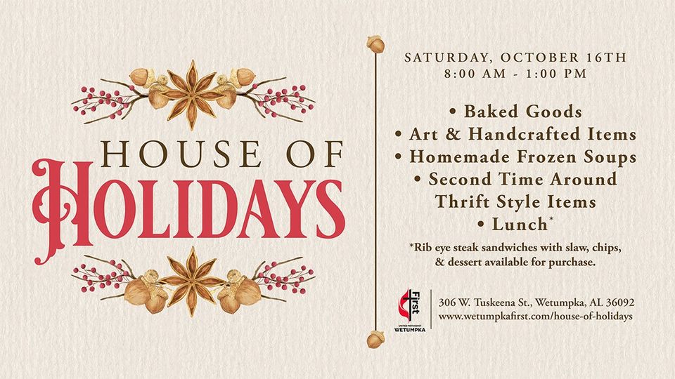 The House of Holidays is an annual bazaar at First United Methodist Church of Wetumpka. This is a great chance to support the community, get ahead on some holiday gifts, and find decorations, arts, crafts, and more for Fall, Thanksgiving, and Christmas.