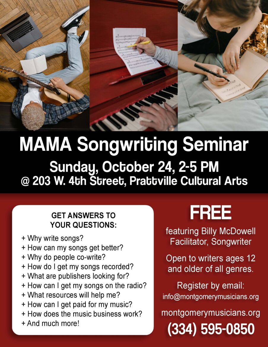 The City of Prattville is pleased to partner with the Montgomery Area Musicians Association again this year for a free Songwriting Seminar on Sunday, October 24. This seminar will be facilitated by nationally recognized songwriter from Prattville, Billy McDowell.