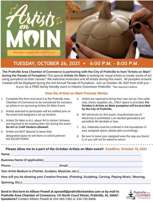 PRATTVILLE, Ala. – The Prattville Area Chamber of Commerce is partnering with the City of Prattville for Artists on Main, scheduled for Oct. 26 from 6:00-8:00 P.M., in conjunction with the Parade of Pumpkins in Historic Downtown Prattville. The registration deadline to participate as an artisan is extended to Oct. 22.