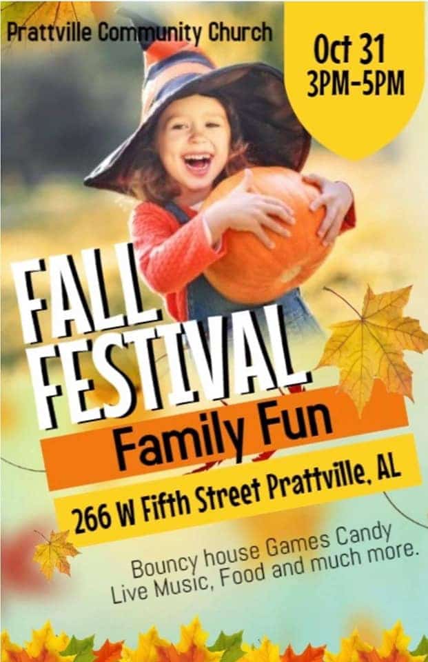 OCTOBER 31 – 3 TO 5 P.M. – PRATTVILLE COMMUNITY CHURCH FALL FESTIVAL