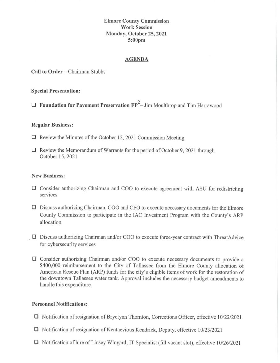 This is the work session agenda for the Commission meeting 10-25-2021.