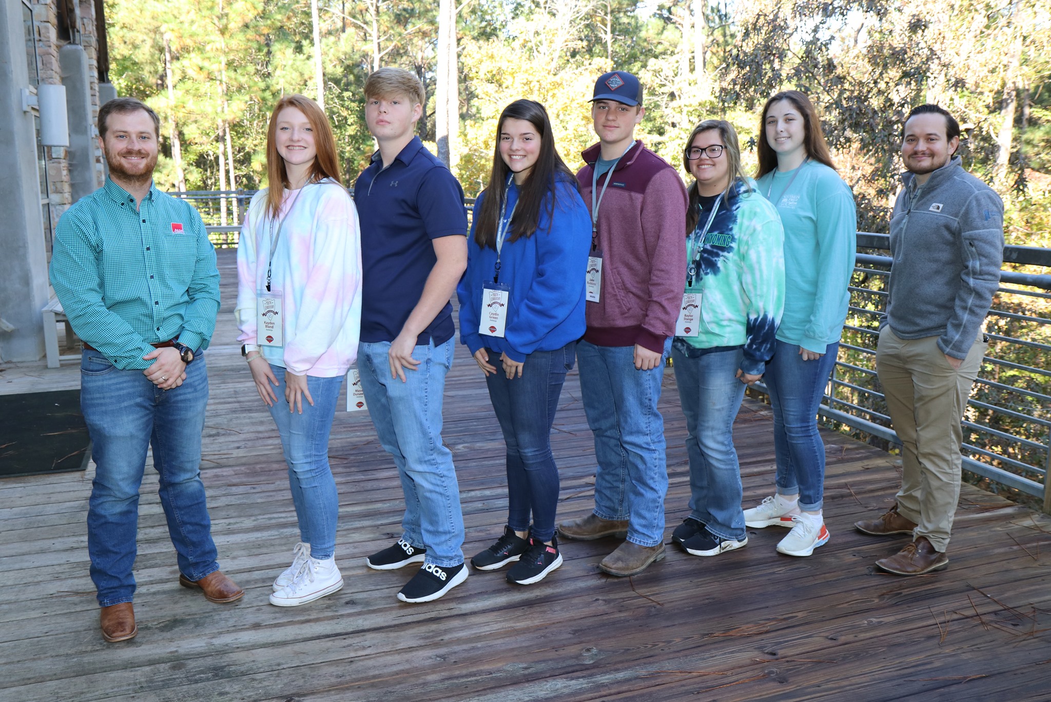 Autauga County students Kayden Bland, Hannah Starnes, Mason Dunaway, Caydin Green, Jake Robbins and Baylor Stange attended the Alfa Youth Leadership Conference Nov. 1-2 at the Alabama 4-H Center in Columbiana. The conference for 9th and 10th grade students teaches them how to advocate for agriculture, identify their potential and step into leadership roles. Sponsors are the Alabama Farmers Federation, Autauga County Farmers Federation and Alabama Farm Credit. Bland, Green and Stange are students at Billingsley High School, while Starnes, Dunaway and Robbins attend Autauga Academy. From left are Alabama Farmers Federation’s Hunter McBrayer, Bland, Dunaway, Green, Robbins, Stange, Starnes and Alabama Farm Credit’s Jacob Robertson.