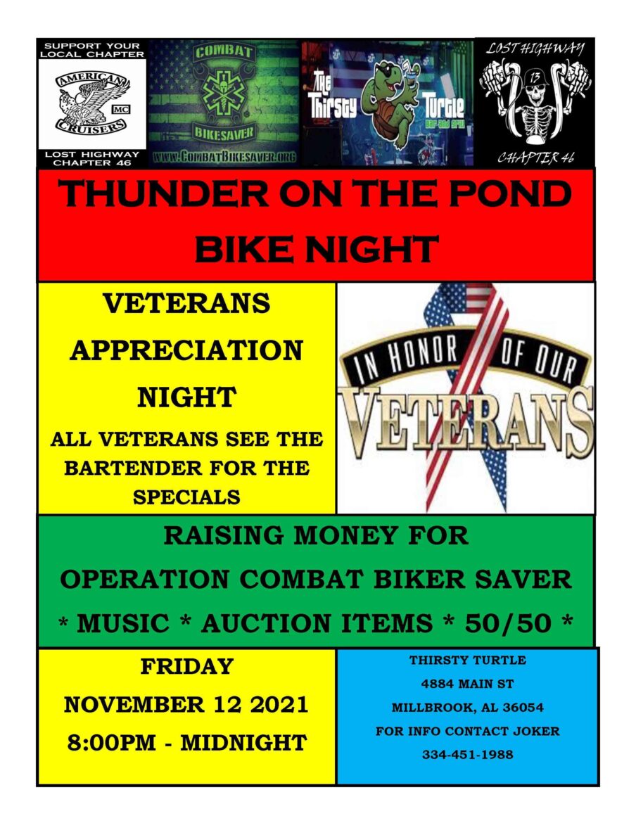 The event begins at 8 p.m.. Hosts include the American Cruisers MC and Combat Bikesaver. All Veterans are asked to see the bartender for specials. The event is raising money for Operation Combat Bike Saver of Tallassee for the construction of a new building. There will be music, auction items and a 50/50 drawing.