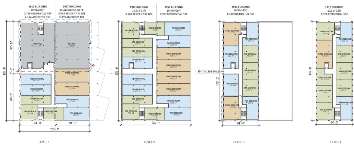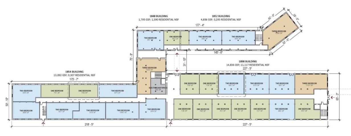 The over 150-year span of original construction is illustrated through an evolution of design techniques and architectural styles. To maintain historic conditions, the interior design kept much of the original structure exposed. The development now features over 70 unique floor plans that offer a wide range of views to the creek, dam, downtown, or public spaces.”