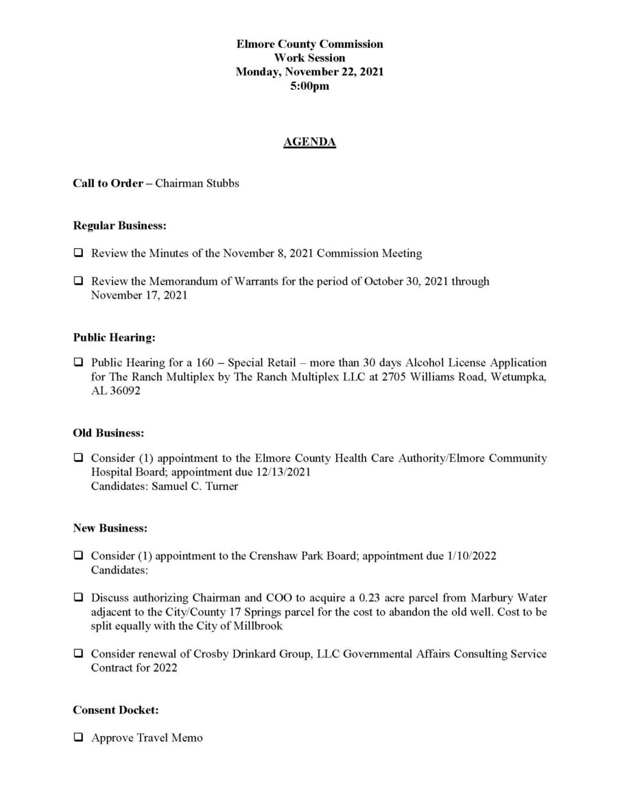 The Elmore County Commission meets on the 2nd Floor of the Historic Elmore County Courthouse, downtown Wetumpka. Work Session starts at 5:00 p.m. and Commission meeting soon after, normally about 6:00 p.m.
