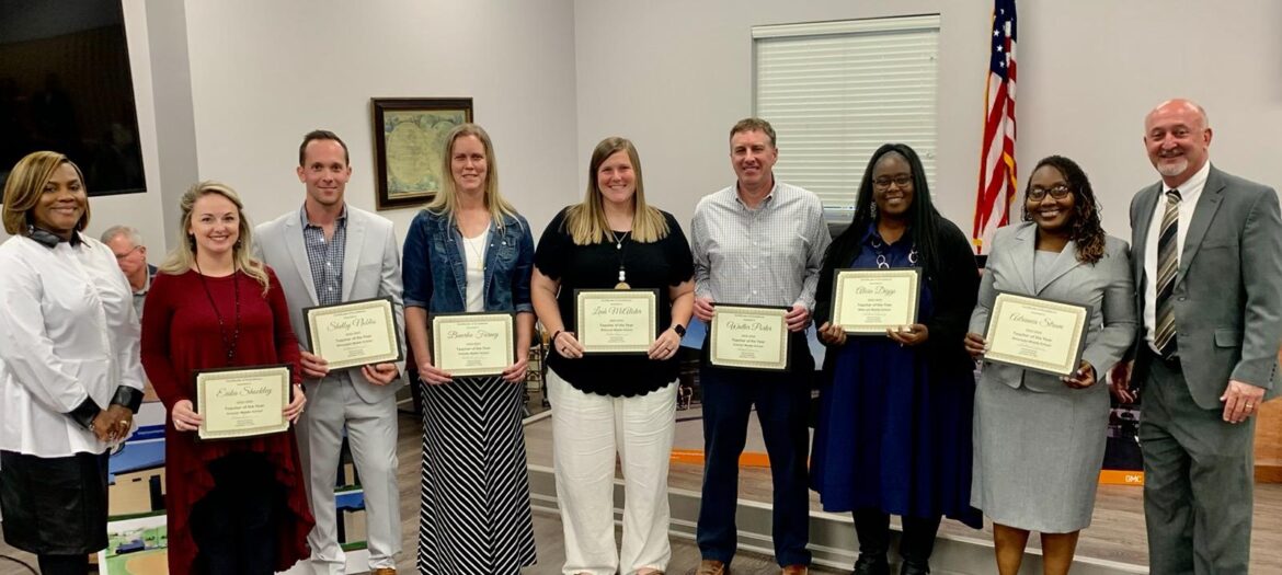Teacher of the Year awards for the K-6th Elementary are: Zoie Frazier (ARIS), LaNaye Stokes (CES), Emily Wells (EES), Sheila Wright (HES), Susan Debrow (RES), Stacey Williams (WES), Ericka Shockley (EMS), Beverlee Forney (HMS), Leah McAlister (MMS), and Shelby Nobles (WMS).