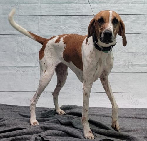 Dolly is a two-year old female Hound, about 60 lbs. She is a tall girl, super sweet, lovely as can be, does have a wonderful melodious hound voice. Dolly is great with other dogs and cats, good on a leash, loves toys and belly rubs.