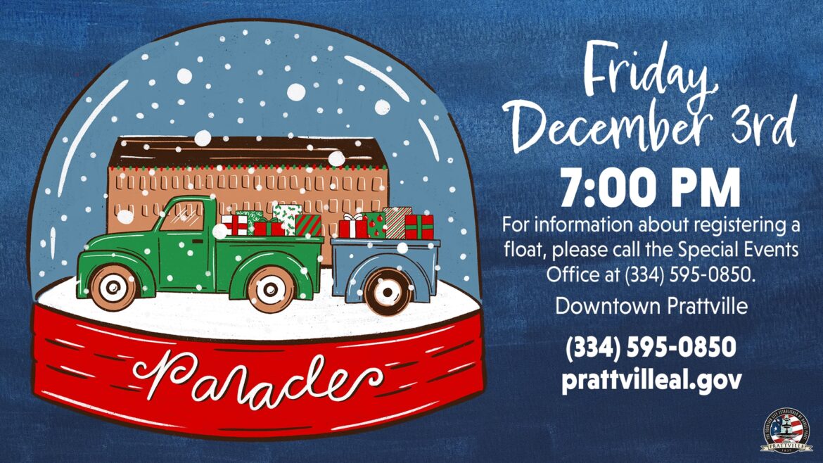 The Prattville Christmas Parade will be held on Friday, December 3, at 7:00 p.m. in downtown Prattville. For more information, contact the Special Event Office at 334-595-0850.