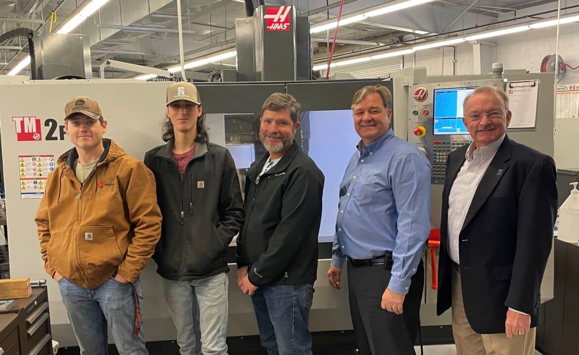 In the picture, left to right are Sloan Hornsby, student; Sevin Smith, student; Scotty Carr, Machine Shop instructor; Michael Barnette, Dean of Workforce, CACC; and Jeff Lynn, president, CACC