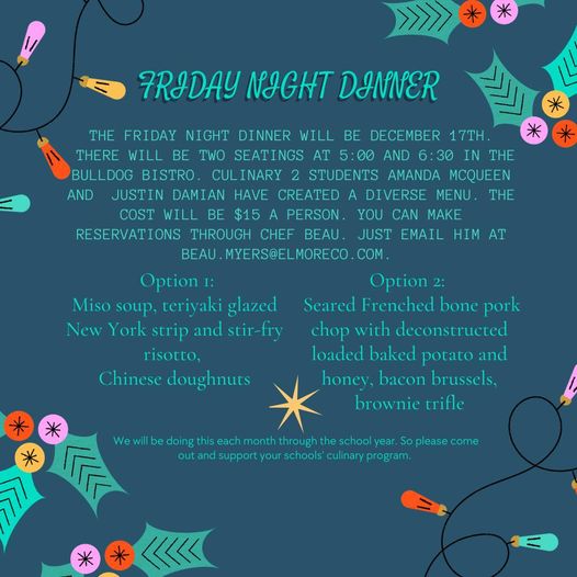 There are two seating times Friday night, one at 5 p.m. and the second at 6:30 p.m. in the Bulldog Bistro. This is located at the back of Holtville High.
