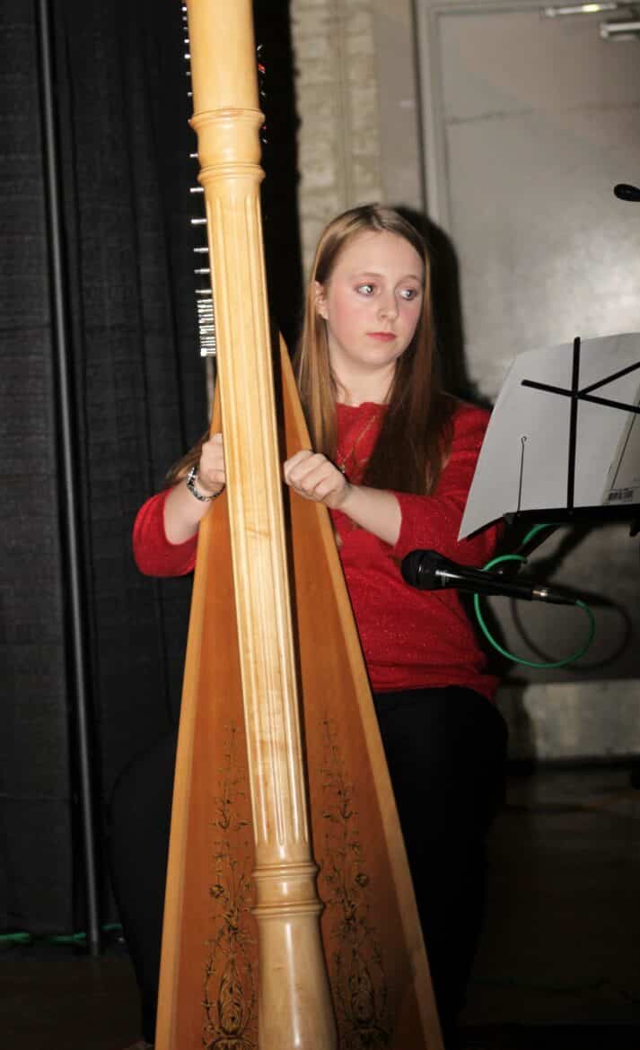 Paula Huett sang a beautiful rendition of “White Christmas”. Homeschooled student Burgandy Huntzinger brought the gentle, angelic sounds of the harp to the table with her version of “Mary, Did You Know?”