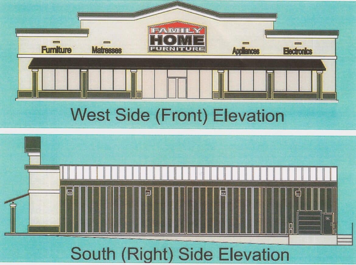 Family Home Furniture will give up their temporary space for a new building on Grandview Road. The site is .91 acres and an 11,000 square foot freestanding store will be constructed. It will be a raised parapet front entrance with awning, Decoplast front exterior, metal sides and trim.