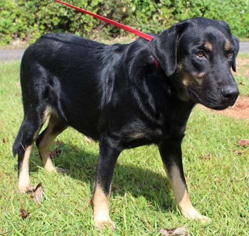 ‘s medium length coat is black with brown markings mostly on his legs. He is a very good looking guy who weighs 82 pounds. Shadow is just as sweet as he can be! This gentle giant gets along well with other dogs and would be just fine in a home with children. However, as previously stated, he is not good with cats. Shadow is well behaved and calm. He is a sweet dog and very trainable.