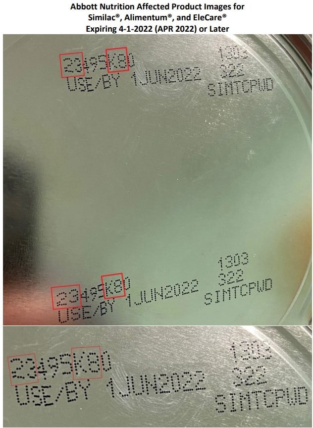 Abbott Nutrition is voluntarily recalling these products after four consumer complaints related to to Cronobacter sakazakii or SalmonellaNewport in infants who had consumed powder infant formula manufactured in this facility. No distributed product has tested positive for the presence of either of these bacteria; however, routine testing is ongoing. As a proactive measure, the FDA is advising consumers not to use Similac®, Alimentum® and EleCare® powdered formulas if:
