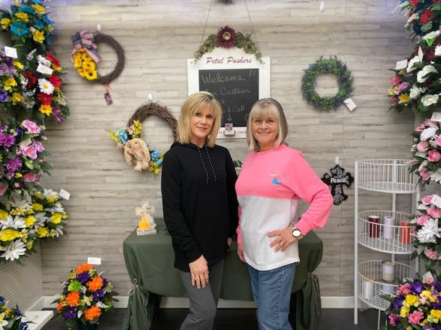 Owners of “Petal Pushers,” Debbie and Sherry, create custom cemetery flowers for gravesites with small, medium, and large flower saddle and cone arrangements and casket flowers, too.
