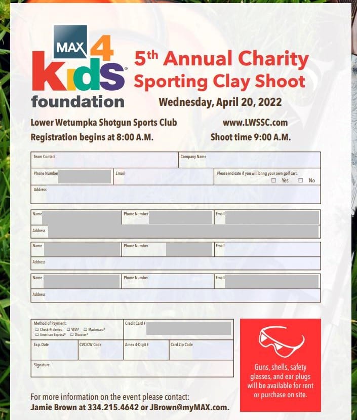 Please make checks payable and send payment to MAX4Kids Foundation, C/O MAX, P.O. Box 244040, Montgomery, Alabama, 36124-4040.