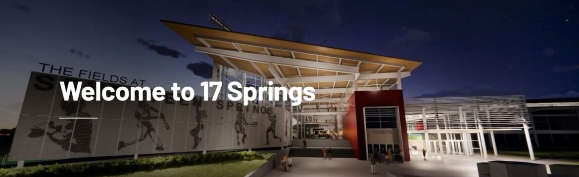 Looking for an iconic name for the joint development of recreational, entertainment and retail opportunities, the partnership settled on 17 Springs as the name to serve as its brand. From the basis of 17 Springs, the recreational outdoor area has been dubbed “The Fields at 17 Springs” while the future event center has been named “The Fieldhouse at 17 Springs”. The adjacent commercial areas planned as a dining, hospitality, shopping and entertainment district carries the name “The Marketplace at 17 Springs.”