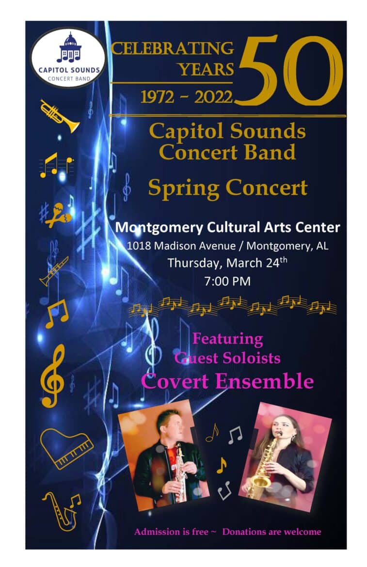 (Montgomery, Ala.) The Capitol Sounds Concert Band will present their Spring Concert on THURSDAY, March 24th, 7:00 p.m., at the Montgomery Cultural Arts Center, 1018 Madison Avenue, Montgomery, AL 36104.