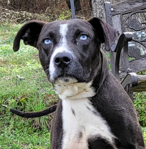 Smudge was found as a stray and brought to us. He is one-year old, about 40 lbs, very striking with his vivid blue eyes. Good with other dogs, loves toys and treats, just wants to be a big lap dog.