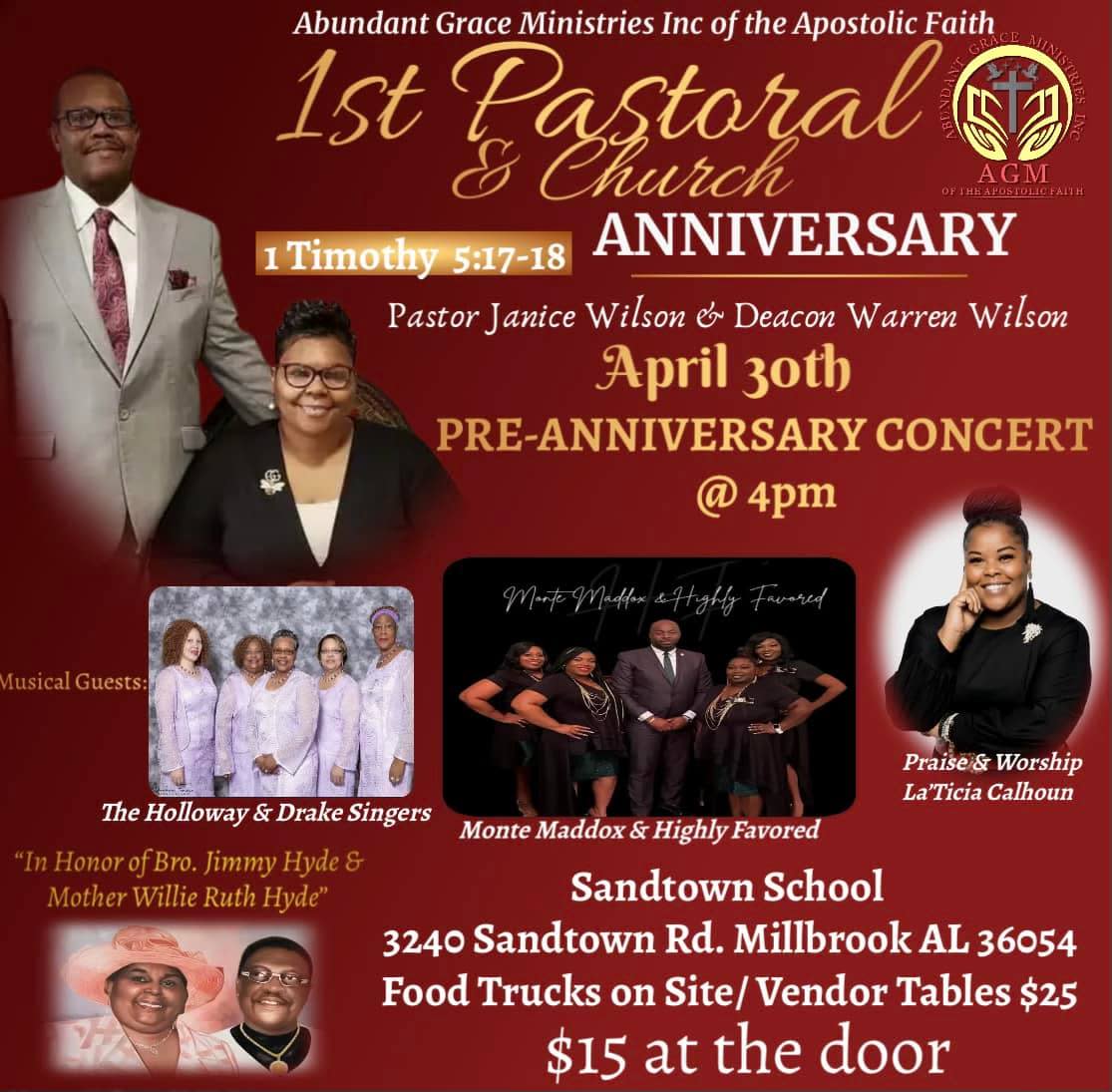 1st Pastoral, Church Anniversary is April 30th for Abundant Grace Ministries at Sandtown School in Millbrook