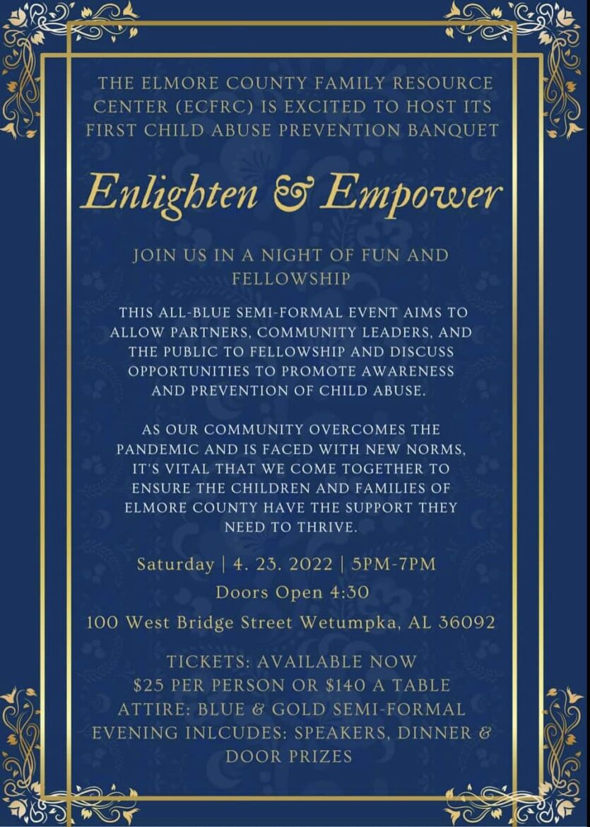 The Elmore County Family Resource Center (ECFRC) is hosting its first Child Abuse Prevention Banquet April 23 from 5-7 p.m. It will be held at 100 West Bridge Street in Wetumpka.