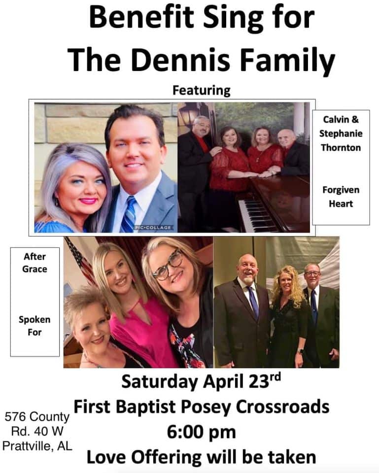 Recently, a valued member of the family singing group died, and a benefit concert will be held Saturday, April 23, at First Baptist Posey Crossroad beginning at 6 p.m. The church is located at 576 County Road 40 West in Prattville.