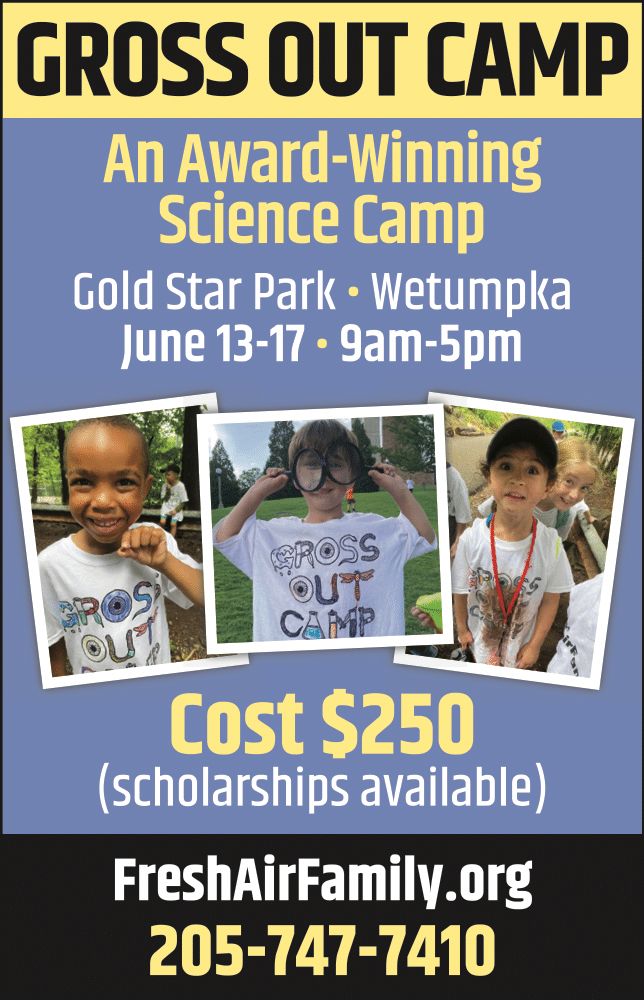 WETUMPKA — If it is icky, stick or gross, it’s Gross Out Day Camp coming to Wetumpka! Slimy salamanders, slugs, bugs, crawdads and roly polies are all found as campers explore their world at camp through hands-on field biology. Camp is held June 13-17 at Gold Star Park.