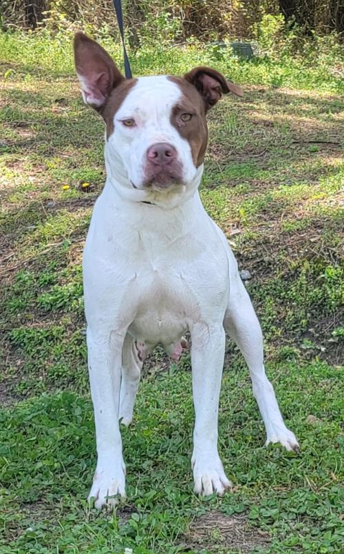Trixie is a one-year-old female American Pit Bull Terrier, about 50 lbs. She is sweet as can be, great with her male dog partner, loves attention. Great with cats.