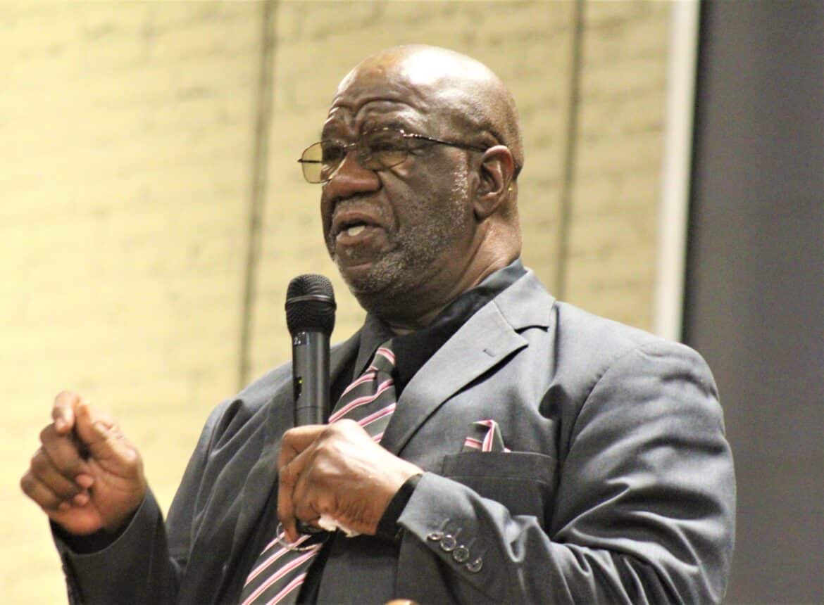 Ell White II gave his qualifications from the stage, saying, “I am a retired Army Major. The military gave me the opportunity to go to school.”