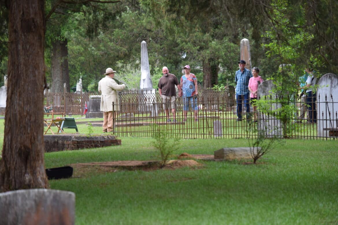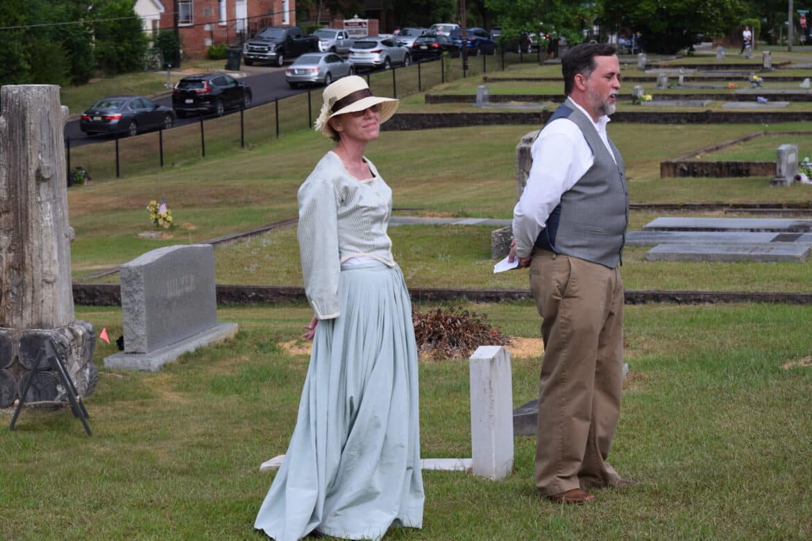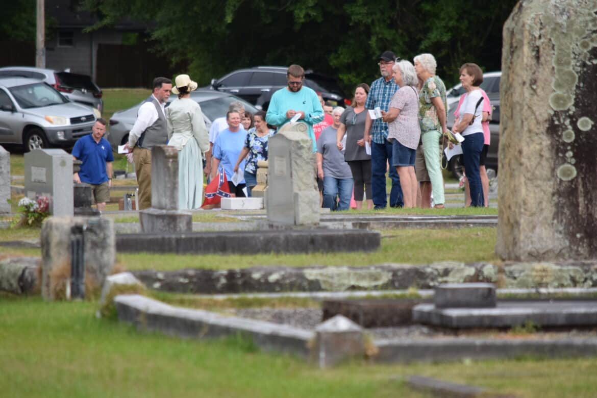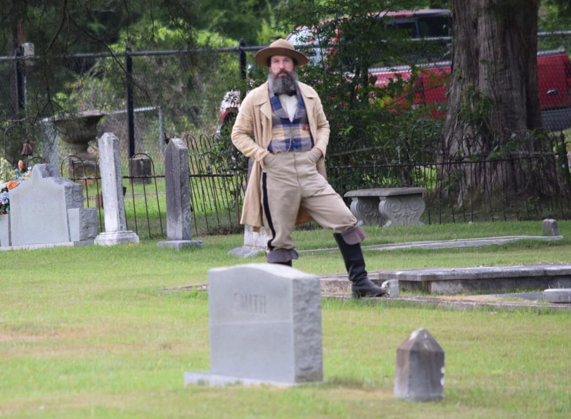 This year was no different as members of the historical society, many in period dress, brought us the stories of eight of the residents of the city cemetery: Alfred and Cora Hester, Charles Kincaid McMorris, John Kelly Fitzpatrick, Alexander Gordon Due, John Jacob Enslen, Josiah Skinner and Cornelius Saxon. They ran the gamut of interest with two civil war veterans, a Spanish Flu victim, an African American WWI veteran, a Smithsonian artist to a fisherman known for catching a 300-pound Sturgeon in the Coosa River. Weather threatened several times to stop the event but stayed off long enough for everyone interested to get a good helping of Alabama history, Wetumpka’s in particular.