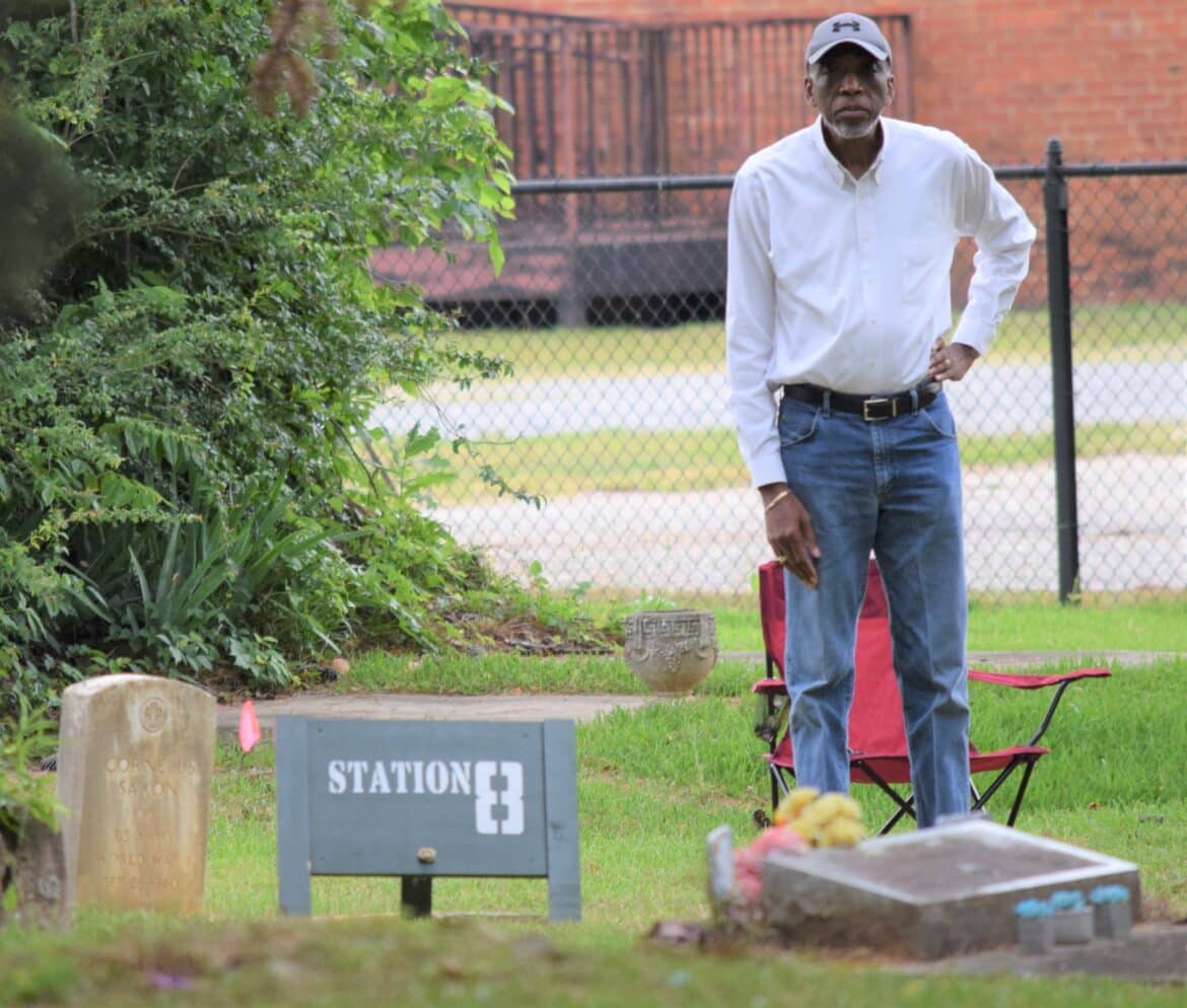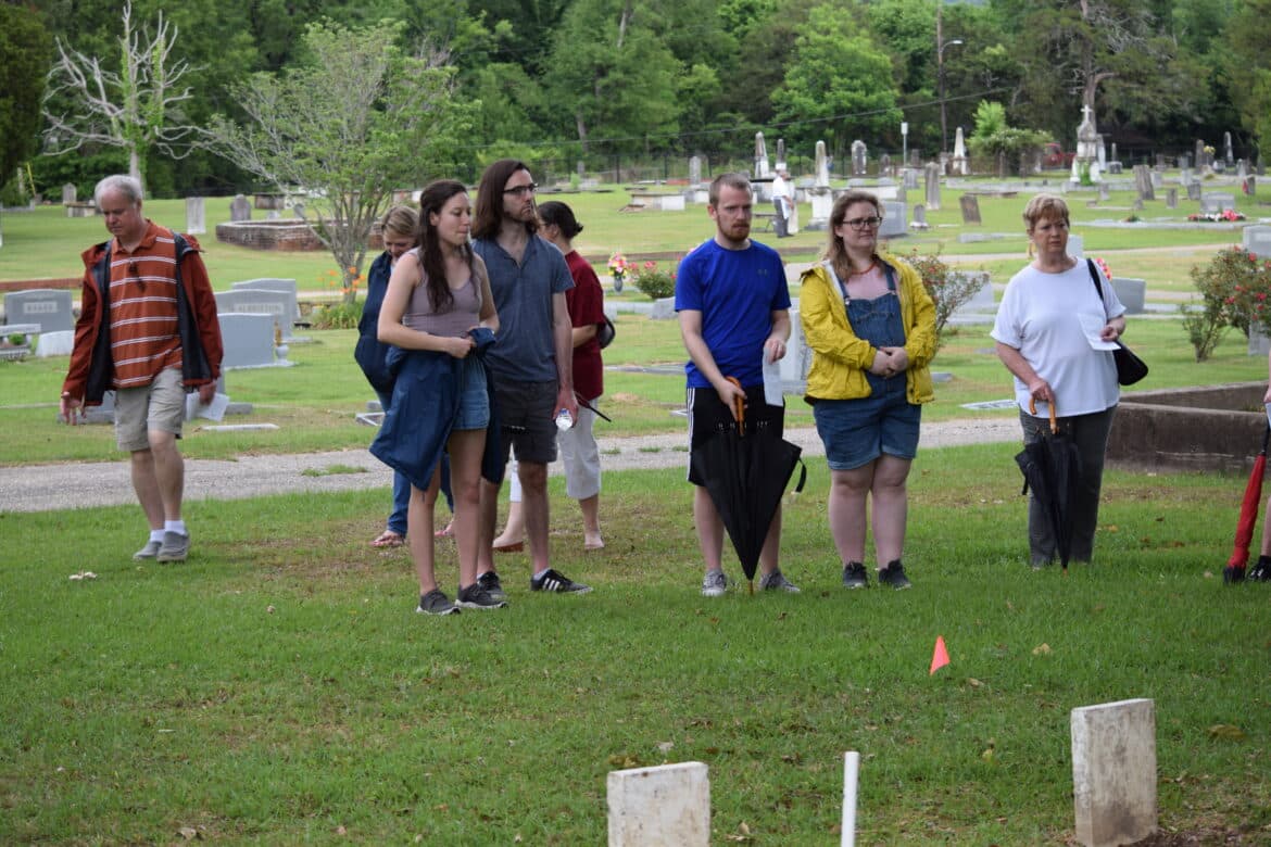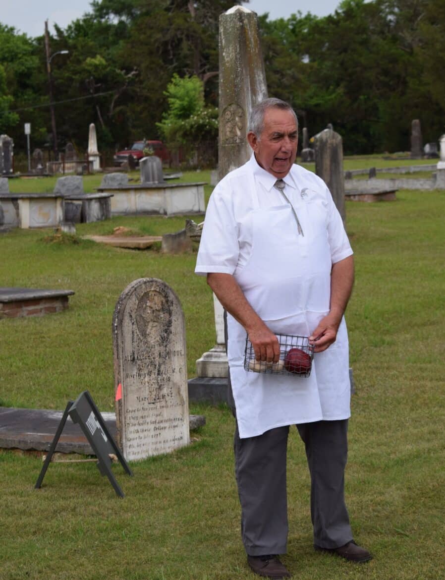 This year was no different as members of the historical society, many in period dress, brought us the stories of eight of the residents of the city cemetery: Alfred and Cora Hester, Charles Kincaid McMorris, John Kelly Fitzpatrick, Alexander Gordon Due, John Jacob Enslen, Josiah Skinner and Cornelius Saxon. They ran the gamut of interest with two civil war veterans, a Spanish Flu victim, an African American WWI veteran, a Smithsonian artist to a fisherman known for catching a 300-pound Sturgeon in the Coosa River. Weather threatened several times to stop the event but stayed off long enough for everyone interested to get a good helping of Alabama history, Wetumpka’s in particular.