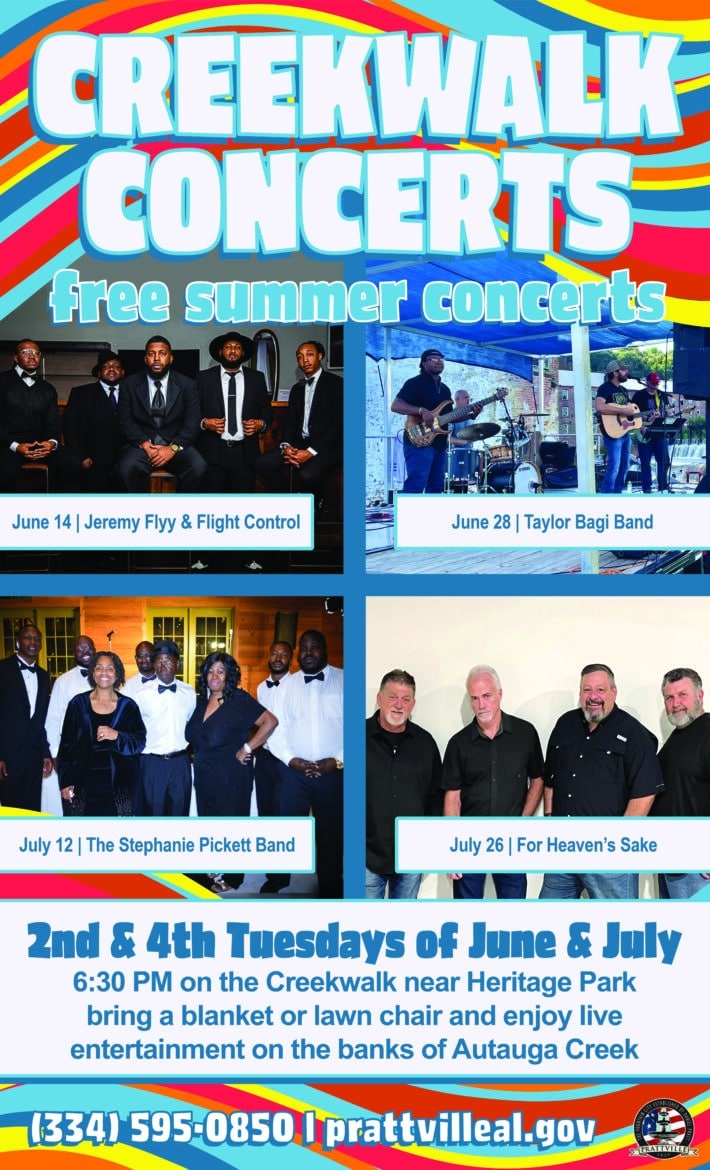 The Prattville Creekwalk Concert Series will kick off Tuesday, June 14, with the R&B and hip hop sounds of Jeremy Flyy and Flight Control. Join us in Downtown Prattville by the Autauga Creek Dam at 6:30 p.m. for this free concert and enjoy music and fun for the entire family.