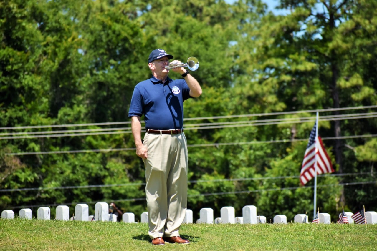 The commemoration featured a wreath-laying ceremony, accompanied by folding of an American Flag, a moment of silence followed by a rifle volley, the playing of Taps, and an Honor Guard salute. The cemetery also had an American flag at the grave of each fallen Alabama Veteran, which were placed by local members of the Cub Scouts and Boy Scouts of America.