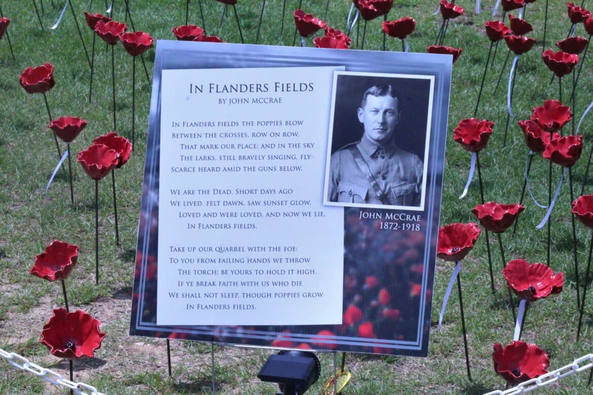 Featured in the field of poppies is the poem by John McCrae called In Flanders Field, which describes poppies blowing in the wind near the crosses on soldier’s graves.