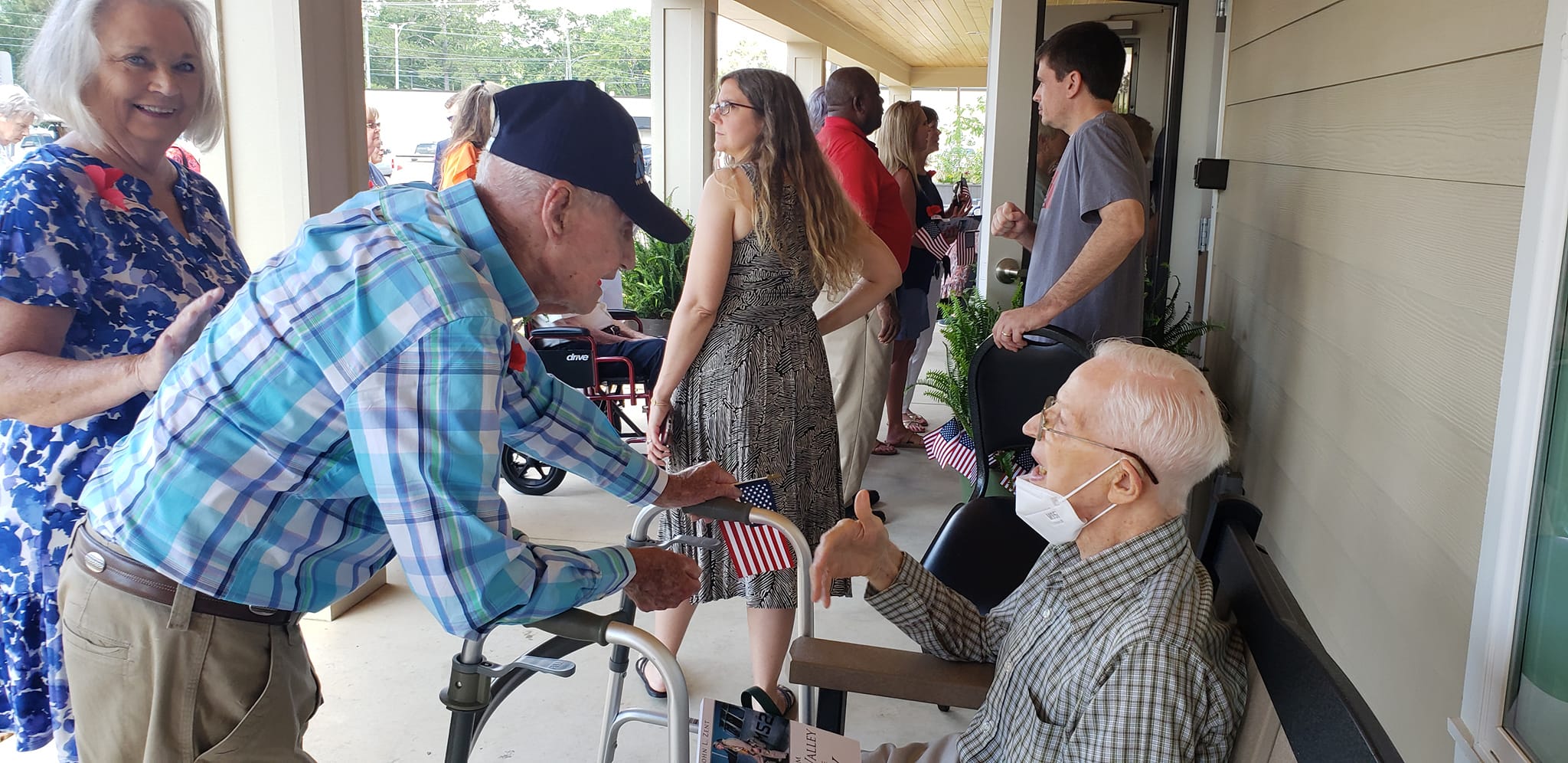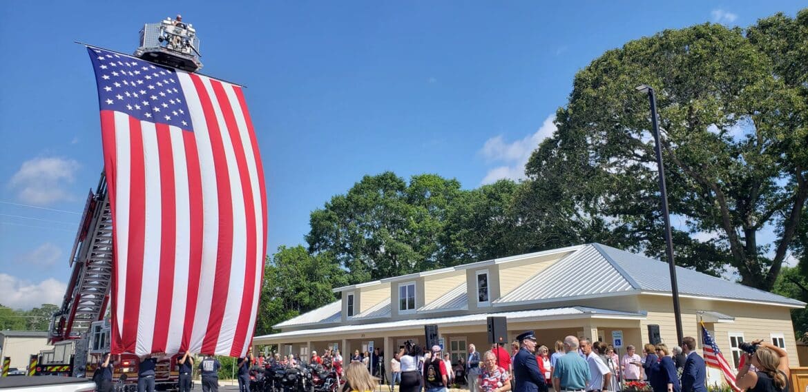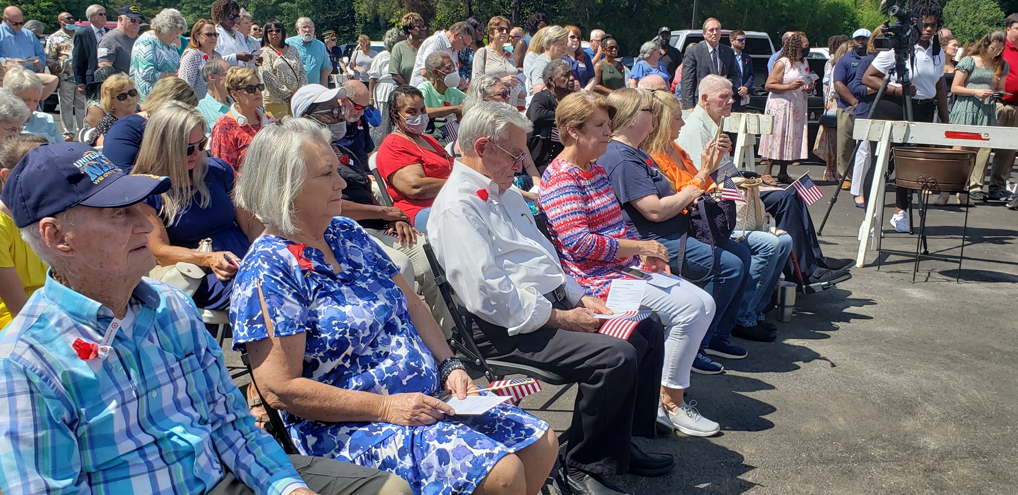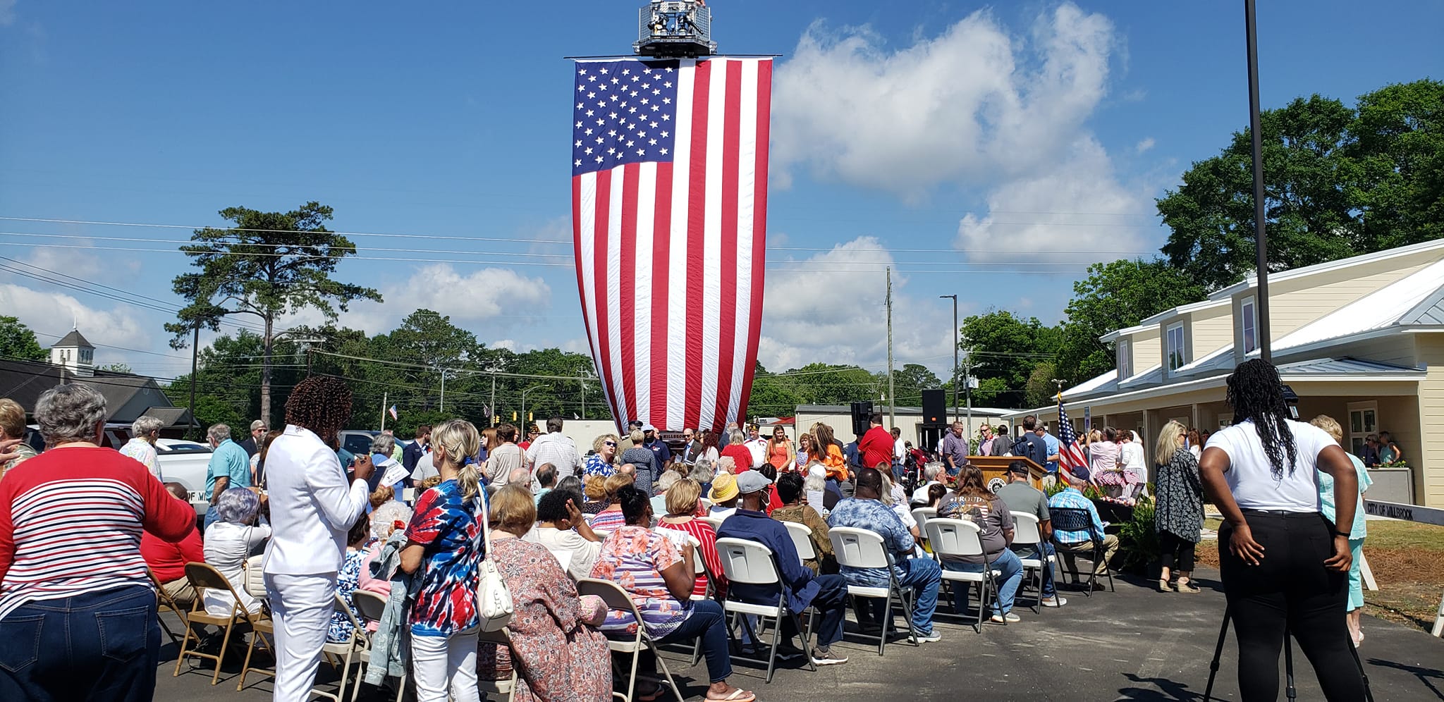 The Memorial Day service was held outside, with the backdrop as a giant American Flag courtesy of the Millbrook Fire Department. Many took advantage of the 100-foot long porch and the shade it provided.