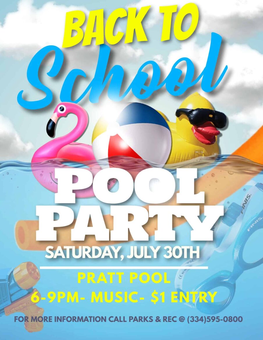 Summer is flying by, and school will be starting soon. Make plans to join us at the Pratt Pool for a “Back to School” night pool party on Saturday, July 30th. $1 admission, music and fun. The party starts at 6pm. For more information, contact the Parks and Recreation Department at (334) 595-0800.