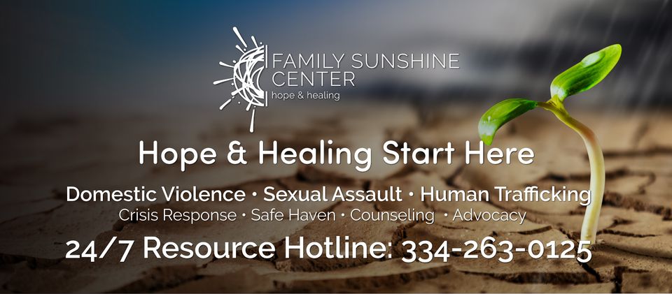 The Family Sunshine Center is dedicated to ending family violence, sexual assault, and human trafficking through comprehensive services and community-based outreach and prevention education. We foster hope and healing through immediate response, safe haven in crisis, advocacy, counseling, and support, so that victims may be empowered to lead safe, violence-free lives. Violence and abuse can affect anyone. Our services are free and available, regardless of race, gender, age, sex, status, or any other factor.