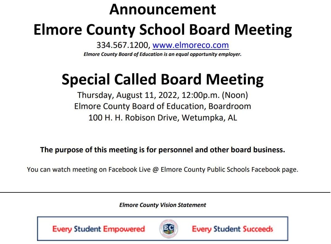 The Elmore County School Board will have a special called board meeting Thursday, Aug. 11, at noon at the Elmore County Board of Education Boardroom located at 100 H.H. Robison Drive in Wetumpka.