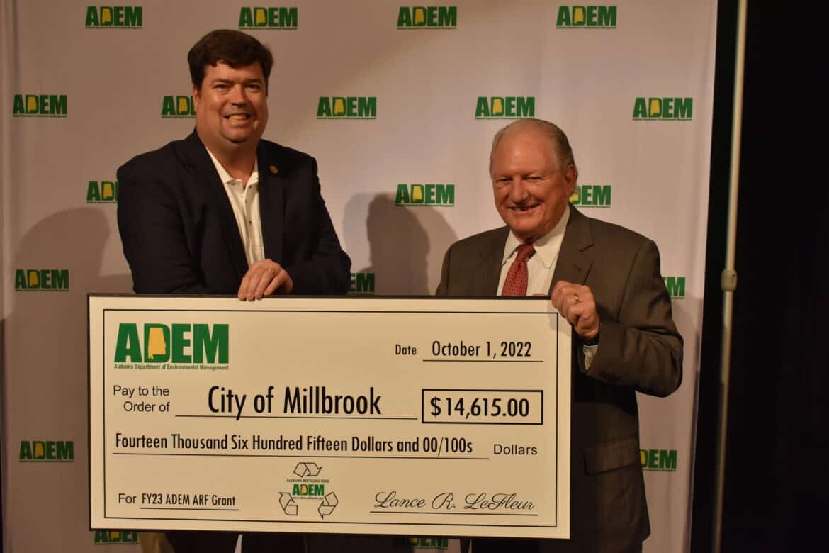 The City of Millbrook was one of 22 grantees in Alabama to have been awarded funds from the Alabama Recycling Fund in a special check presentation event at the Marriott Legends at Capitol Hill. The City will utilize its $14,365 grant award to purchase and detail a recycling trailer to help improve collection and handling efficiency and elevate awareness of Millbrook’s recycling program throughout the community.