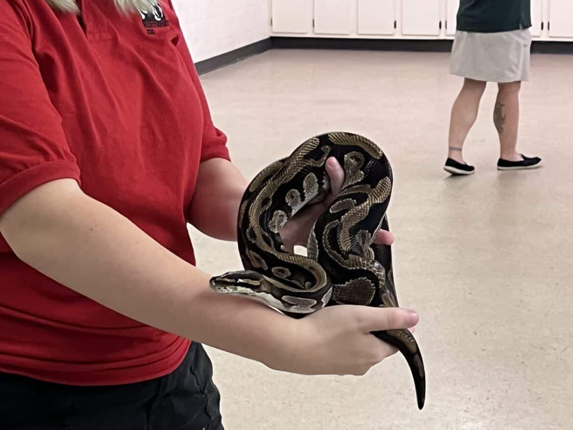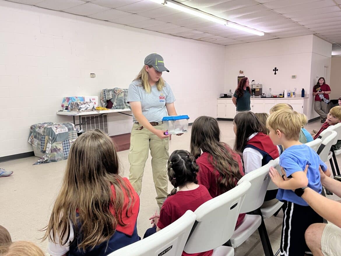 Students and parents alike were invited to attend the meeting last night to learn more about what the troops do as well as learn about the animals of the Bible. This program is just one of many that the Montgomery Zoo provides to groups and classes across the area. Danielle Crowe, the Education Curator with the zoo, brought out many animals from their education department to show the attendees. Animals included were an Emperor Scorpion, Ball Python, Bearded Dragon, Australian Dingo and more. Crowe explains that her department “Comes out to events like this to get children excited about learning about animals and the zoo can cater to any type of event or program a group may need.” Crowe, along with her team, explained all about these animals and how they existed during Biblical times and their importance in Scripture. It was quite informative and the children really seemed to enjoy the event.
